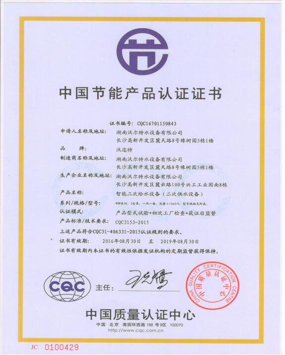 湖南沃爾特水設(shè)備有限公司產(chǎn)品獲中國節(jié)能產(chǎn)品認(rèn)證